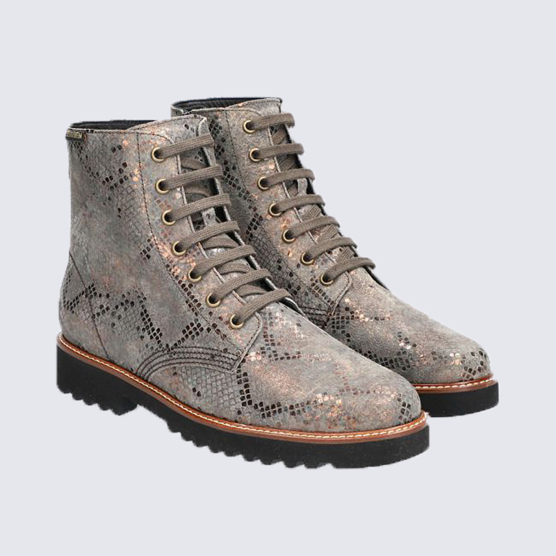 Ces bottines à lacets au style classique de la marque Mephisto sont les chaussures idéales pour les temps humides des mois d'automne et d'hiver. L'intérieure de la chaussure, entièrement doublée en cuir, offre chaleur et confort. Ces chaussures, composée de cuir, sont imprimées imitation reptile.