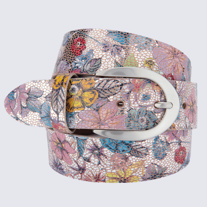 Ajoutez une touche artistique et raffinée à votre tenue avec cette ceinture en cuir véritable signée Bernd Götz, fabriquée en Allemagne. Son motif floral coloré sur fond métallisé argenté reflète subtilement la lumière, offrant un style à la fois original et élégant. La boucle en forme de fer à cheval, finition argentée, complète parfaitement cet accessoire de caractère. Confortable grâce à son cuir souple, elle se porte aussi bien avec un jean qu’avec une robe pour un look chic et tendance au quotidien. Découvrez toute la collection Bernd Götz sur igert.fr !