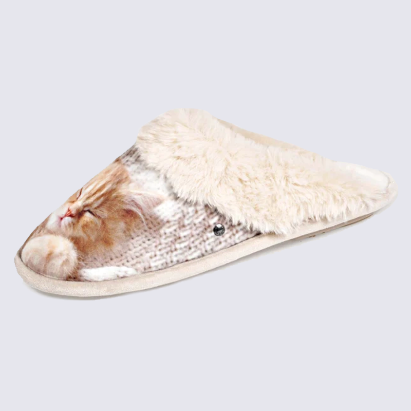 Ces mules chaudes femme de la marque Isotoner vous assurent un confort optimal et une qualité incomparable. Ces chaussons mules beiges vous apporteront une touche de fantaisie grâce à leur nouvelle technique d'impression. L'imprimé chat met en avant le caractère original de la marque de chaussons Isotoner. Le tissu en microvelours ainsi que la fausse fourrure apportent de la douceur à vos journées d'hiver.