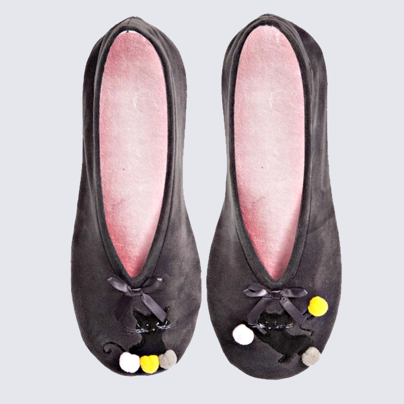 Ces chaussons ballerines femme vous plairont grâce à leur design orignal. Ces chaussons ballerines sont agrémentées de pompons et ont un imprimé chat ce qui les rendent uniques. Leur qualité, leur douceur grâce au microvelours assurent un toucher ultra doux. La doublure intérieure de ces chaussons femme en coton est issue de l'agriculture biologique.